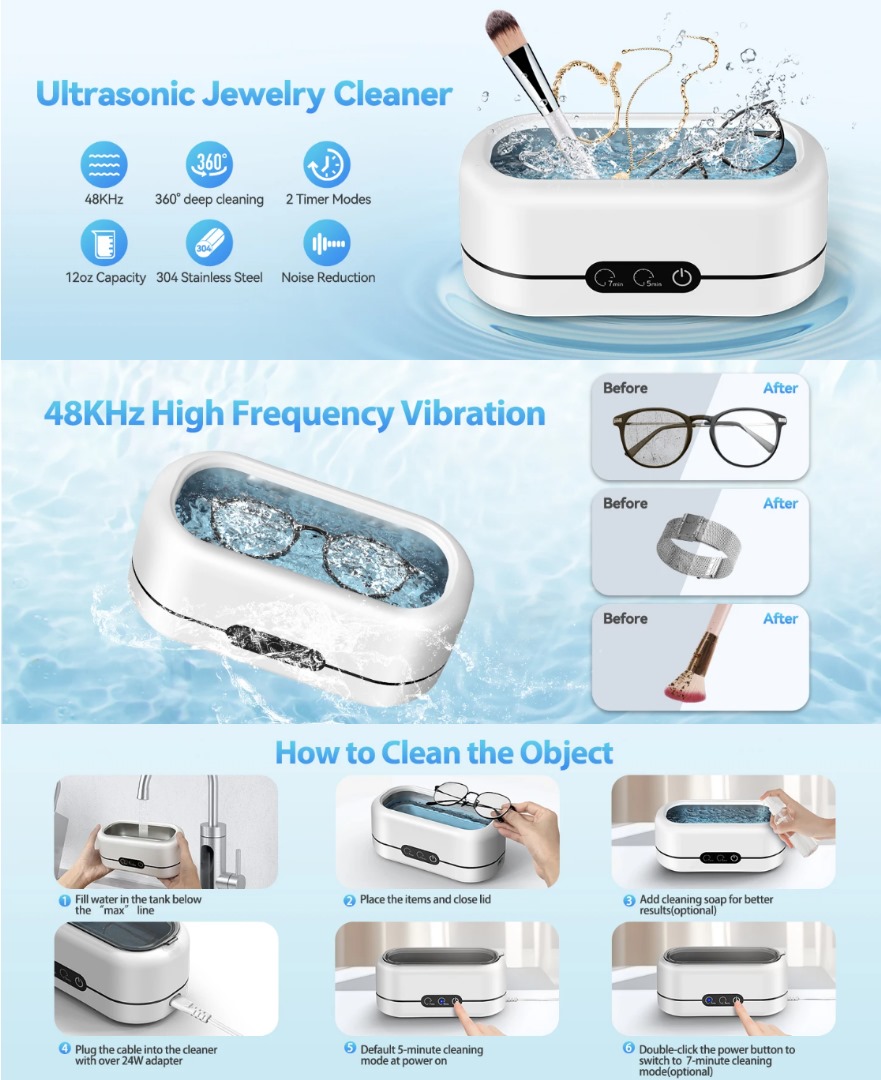 Mit diesem kompakten Ultraschallreinigungsgerät geniessen Sie jederzeit glasklare Sicht und funkelnden Glanz – ganz ohne Aufwand. Perfekt geeignet für Brillenliebhaber, Schmuckträger und alle, die Wert auf hygienische Sauberkeit und gepflegte Accessoires legen.